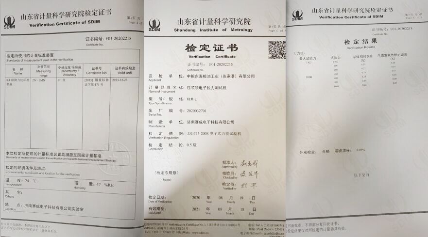 為了更好的交付這批設備,確保設備測試數(shù)據(jù)的準確性,濟南賽成儀器向山東省計量科學研究院提出了檢定申請。依據(jù)JJG475-2008電子式萬能試驗機的檢定規(guī)程,省計量院工作人員對XLW-L包裝袋電子拉力試驗機的精度和誤差等進行了檢定,經(jīng)檢定結(jié)論達到0.5級,檢定結(jié)果合格。2020年8月9日獲得山東省計量科學研究院頒發(fā)的檢定證書,獲得的這份檢定證書,進一步證明了濟南賽成儀器符合預定要求和質(zhì)量要求,測量結(jié)果準確,儀器持續(xù)可靠,性能穩(wěn)定。